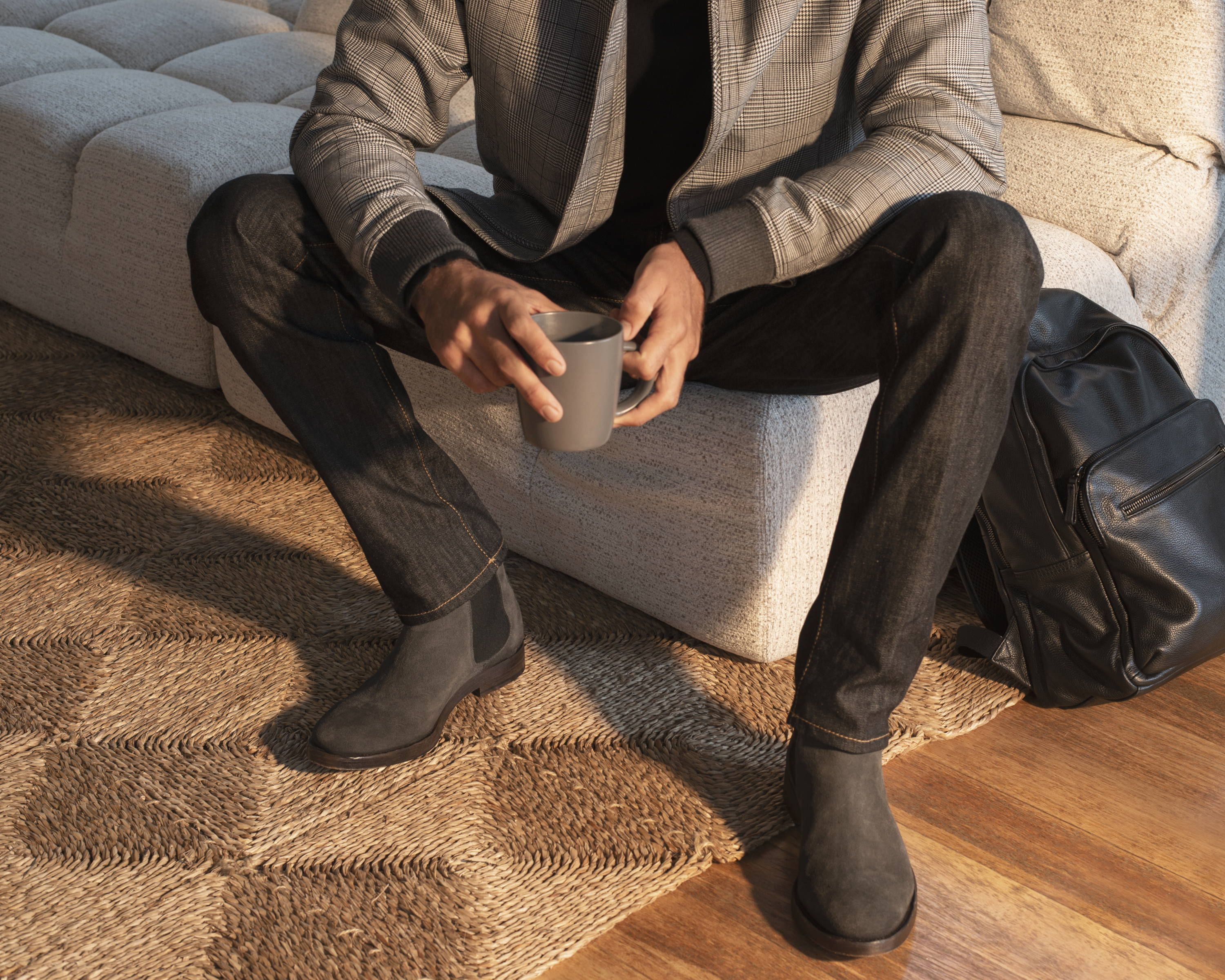 There are a couple of directions you can go here. The first is a classic, weekend casual look: the suede Chelsea boot. Our favourite is the QUINTANA. These look great underneath slim-fit jeans and a simple t-shirt, with a low heel and rounded toe to keep things casual. The soft suede gives your foot a bit of texture, too. Otherwise, you can ditch the suede and get a bit fancy. Imagine a woven knit blazer, some premium dark denim, and a well-heeled HUTTON Chelsea boot, hand-made in Italy. We make these guys from soft leather and Sacchetto construction – they’re a good balance between formal lines and low-key footwear.